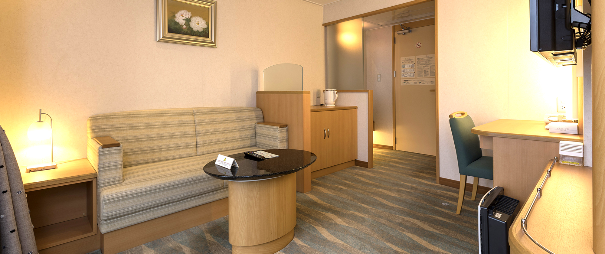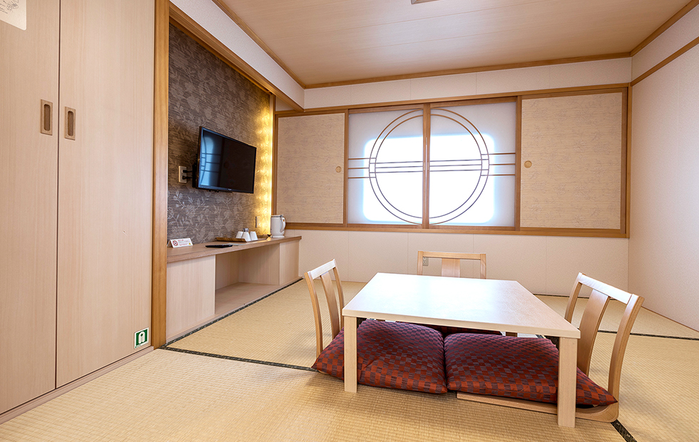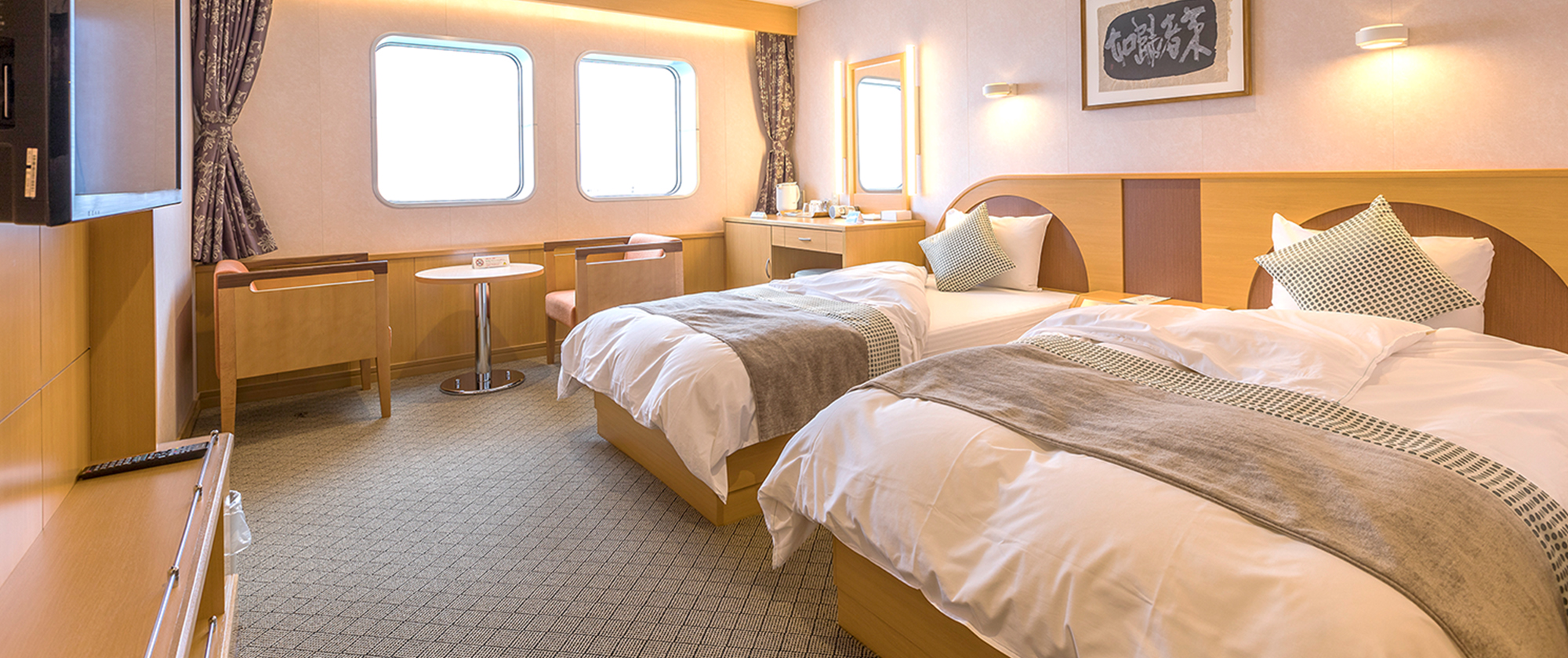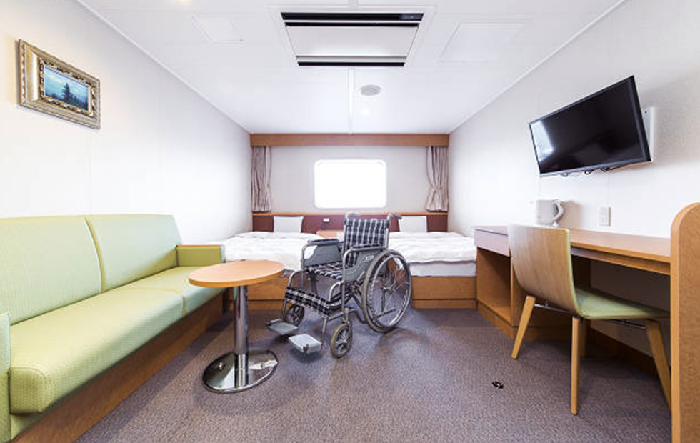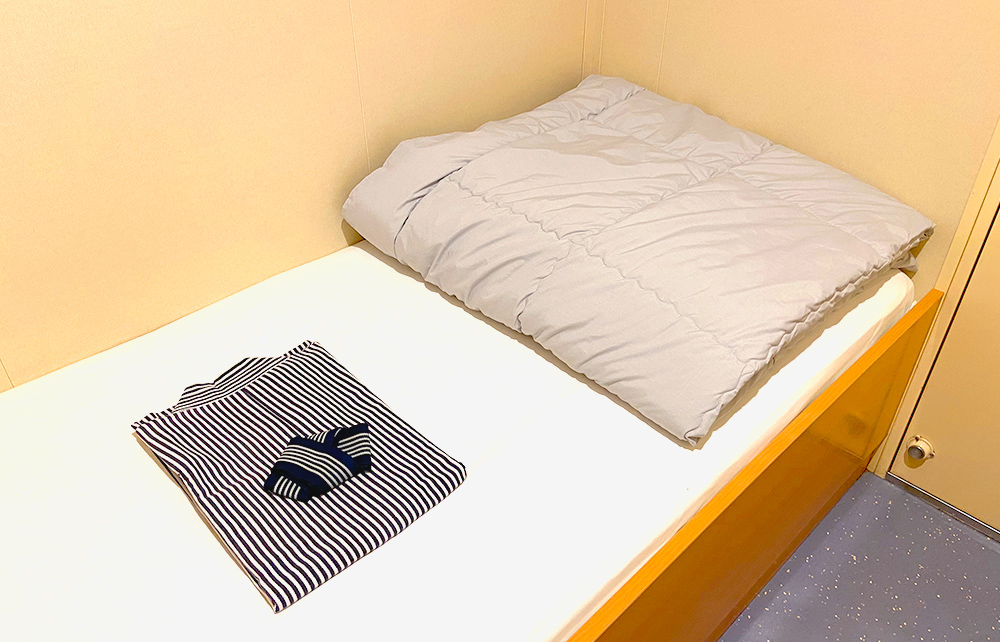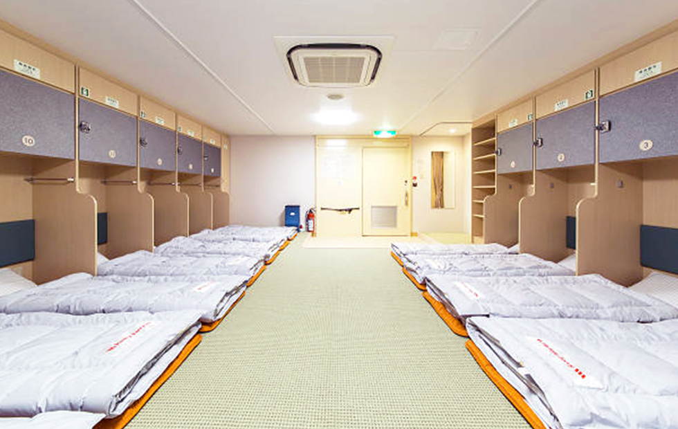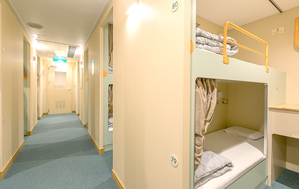 ※定期検査などで配船が変更になる場合がございます。※いずみ・ひびきの船内設備は同じです。 7Fフロア ロイヤル バス・トイレ・テレビ・プライベートデッキ付き 部屋タイプ:洋室 定員・部屋数:2名・2室 広さ:36.5㎡ ㎡ ベッド幅:110×200(cm) スイート バス・トイレ・テレビ付き 部屋タイプ:洋室 定員・部屋数:2名・20室 広さ:21.1㎡ ㎡ ベッド幅:100×200(cm) デラックスシングル テレビ付き 部屋タイプ:洋室 定員・部屋数:1名・28室 広さ:5.2㎡ ㎡ ベッド幅:80×200(cm) 7Fフロアの間取りはこちら 7Fフロア × 6Fフロア デラックス和洋室(3人部屋・4人部屋) テレビ・洗面台付き 部屋タイプ:洋室 定員・部屋数:3名・29室(4名・4室) 広さ:13.5㎡ ㎡ ベッド幅:3人部屋 90×200(cm) 4人部屋 85×200(cm) デラックス和室 テレビ・洗面台付き 部屋タイプ:和室 定員・部屋数:3名・6室 広さ:12.9㎡ ㎡ ベッド幅:70×190(cm) スタンダード洋室(レディースあり) リターン式コインロッカー付き 部屋タイプ:洋室 定員・部屋数:16名・12室 ベッド幅:75×200(cm) 6Fフロアの間取りはこちら 6Fフロア × 5Fフロア デラックス洋室 バリアフリー テレビ・洗面台付き 部屋タイプ:洋室 定員・部屋数:2名・2室 広さ:15㎡ ㎡ ベッド幅:100×200(cm) デラックス洋室 4名部屋 テレビ・洗面台付き 部屋タイプ:洋室 定員・部屋数:4名・20室 広さ:12.4㎡ ㎡ ベッド幅:80×200(cm) スタンダード和室(バリアフリーあり) リターン式コインロッカー付き 部屋タイプ:和室仕様 定員・部屋数:14名・3室、12名・1室※バリアフリー含む ベッド幅:1人分のスペース:約70cm スタンダードシングル(ドライバールーム) 部屋タイプ:洋室 定員・部屋数:1名・102室 ベッド幅:75×200(cm) 5Fフロアの間取りはこちら 5Fフロア ×