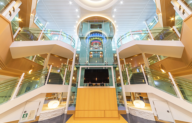 船首部分に作られた展望ルームは、出港時や入港時、今まで見たことのない光景が広がります。また、航海中は、ダウンライトによる落ち着いた空間が演出され、リゾート気分が味わえます。