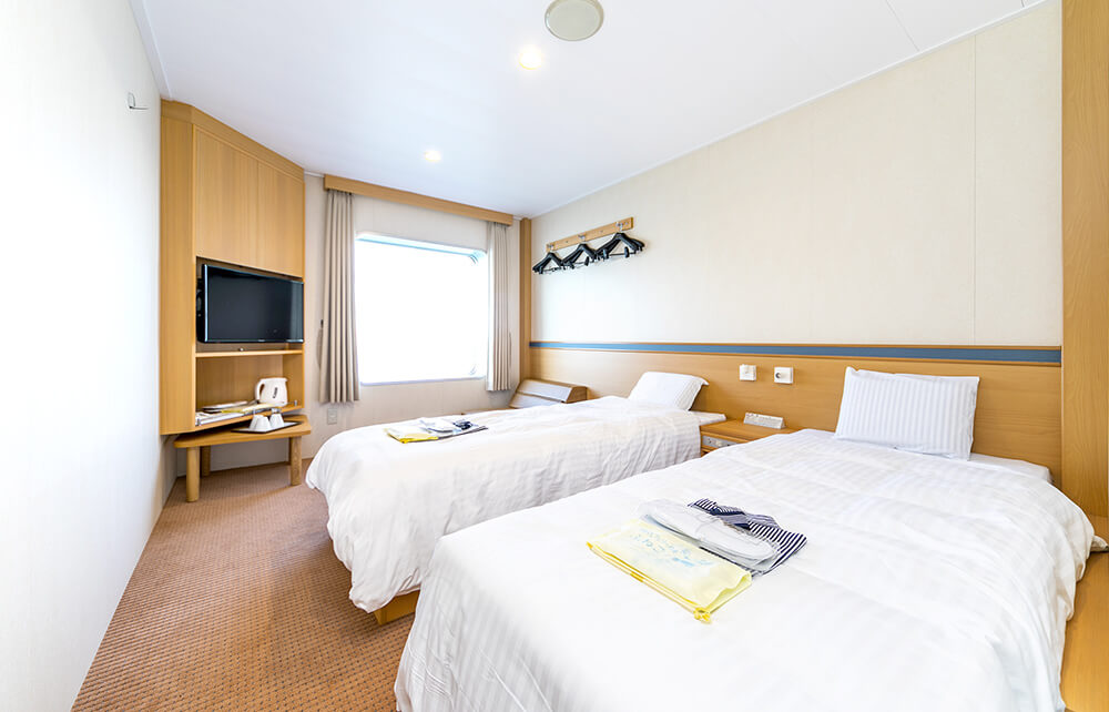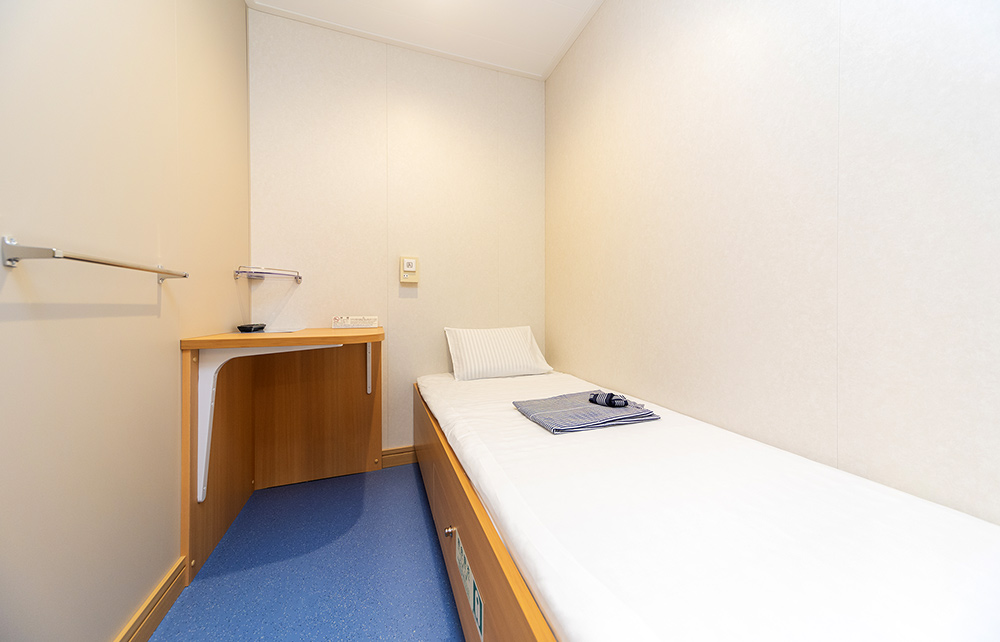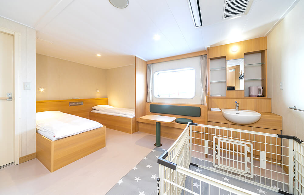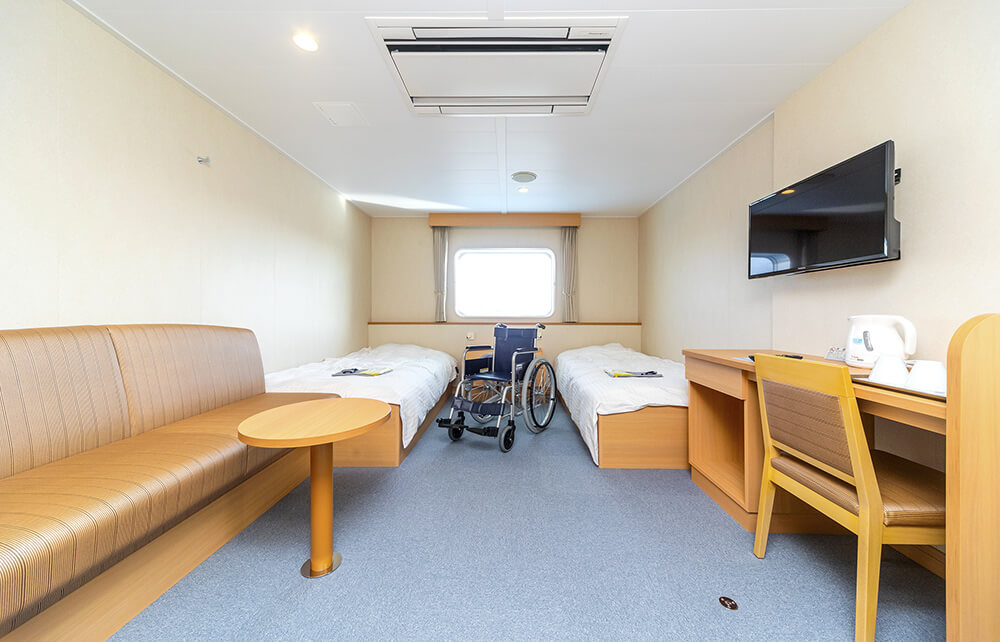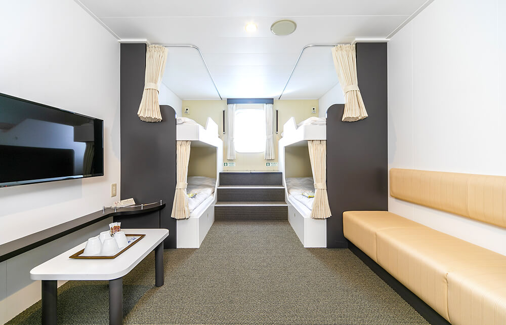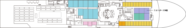 ※定期検査などで配船が変更になる場合がございます。※せっつ・やまとの船内設備は同じです。 7Fフロア ロイヤル バス・トイレ・テレビ・プライベートデッキ付き 部屋タイプ:洋室 定員・部屋数:2名・2室 広さ:35.3㎡ ㎡ ベッド幅:110×200(cm) スイート バス・トイレ・テレビ付き 部屋タイプ:洋室 定員・部屋数:2名・20室 広さ:20.8㎡ ㎡ ベッド幅:100×200(cm) デラックスシングル テレビ・洗面台付き 部屋タイプ:洋室 定員・部屋数:1名・46室 広さ:5.2㎡ ㎡ ベッド幅:80×200(cm) 7Fフロアの間取りはこちら 7Fフロア × 6Fフロア デラックス和洋室(3人部屋) テレビ・トイレ・洗面台付き 部屋タイプ:洋室 定員・部屋数:3名・33室 広さ:13.3㎡ ㎡ ベッド幅:80×200(cm) デラックス和室 テレビ・トイレ・洗面台付き 部屋タイプ:和室 定員・部屋数:3名・6室 広さ:15.7㎡ ㎡ ベッド幅:70×190(cm) スタンダード洋室(レディースあり) リターン式コインロッカー・各自コンセント・自動ロック式カードキー(レディースルームのみ)付き 部屋タイプ:洋室 定員・部屋数:16名・11室/12名・2室/10名・1室/8名・2室 ※5Fフロア部屋数を含む ベッド幅:75×200(cm) 6Fフロアの間取りはこちら 6Fフロア × 5Fフロア デラックス洋室 4名部屋 テレビ・洗面台付き 部屋タイプ:洋室 定員・部屋数:4名・21室 広さ:12.4㎡ ㎡ ベッド幅:80×200(cm) デラックス洋室 バリアフリー テレビ・洗面台付き 部屋タイプ:洋室 定員・部屋数:2名・2室 広さ:14.8㎡ ㎡ ベッド幅:100×200(cm) デラックス洋室 (ウィズペットルーム) ※ペット無しの場合は利用不可テレビ・トイレ・洗面台・ペットサークル・専用ドッグラン併設 部屋タイプ:洋室 定員・部屋数:2名・2室 広さ:15.0㎡ ㎡ ベッド幅:80×200(cm) スタンダード和室(バリアフリー) リターン式コインロッカー・各自コンセント付き 部屋タイプ:和室仕様 定員・部屋数:14名・2室 ベッド幅:1人分のスペース:約70cm スタンダードシングル(ドライバールーム) テレビ付き 部屋タイプ:洋室 定員・部屋数:1名・110室 ベッド幅:75×200(cm) 5Fフロアの間取りはこちら 5Fフロア ×