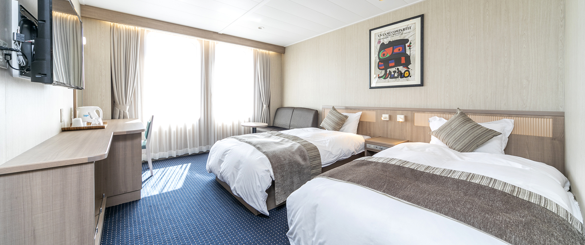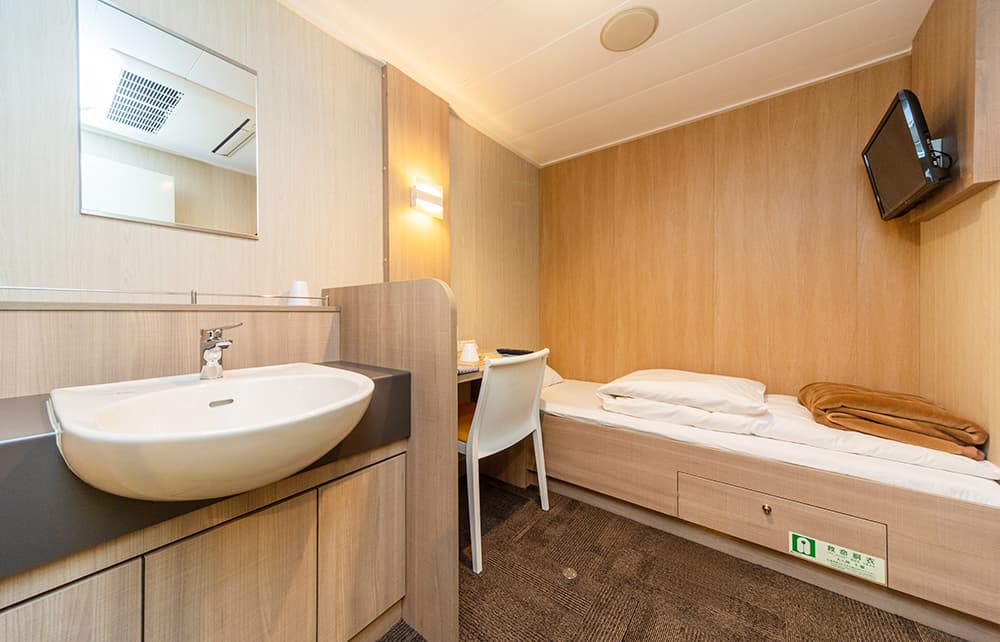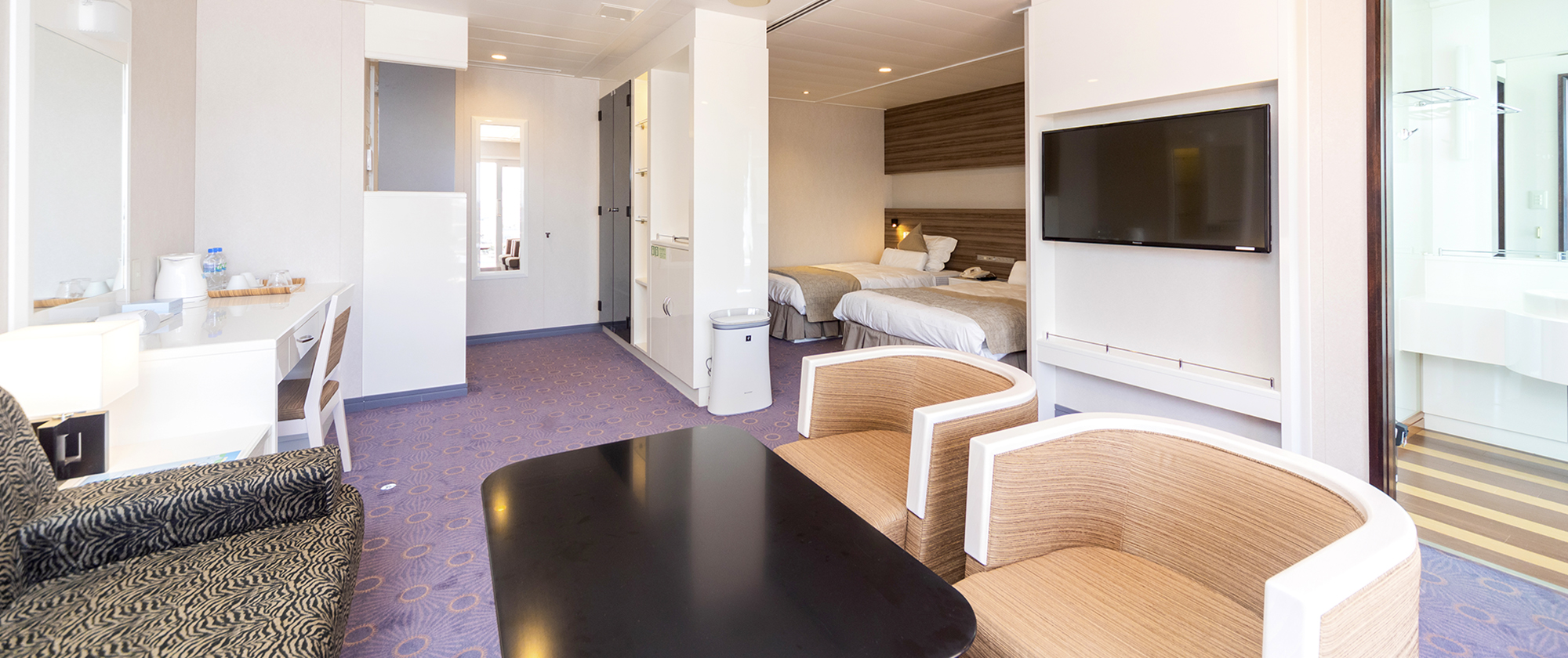 ※定期検査などで配船が変更になる場合がございます。※せっつ・やまとの船内設備は同じです。 7Fフロア ロイヤル バス・トイレ・テレビ・プライベートデッキ付き 部屋タイプ:洋室 定員・部屋数:2名・2室 広さ:35.3㎡ ㎡ ベッド幅:110×200(cm) スイート バス・トイレ・テレビ付き 部屋タイプ:洋室 定員・部屋数:2名・20室 広さ:20.8㎡ ㎡ ベッド幅:100×200(cm) デラックスシングル テレビ・洗面台付き 部屋タイプ:洋室 定員・部屋数:1名・46室 広さ:5.2㎡ ㎡ ベッド幅:80×200(cm) 7Fフロアの間取りはこちら 7Fフロア × 6Fフロア デラックス和洋室(3人部屋) テレビ・トイレ・洗面台付き 部屋タイプ:洋室 定員・部屋数:3名・33室 広さ:13.3㎡ ㎡ ベッド幅:80×200(cm) デラックス和室 テレビ・トイレ・洗面台付き 部屋タイプ:和室 定員・部屋数:3名・6室 広さ:15.7㎡ ㎡ ベッド幅:70×190(cm) スタンダード洋室(レディースあり) リターン式コインロッカー・各自コンセント・自動ロック式カードキー(レディースルームのみ)付き 部屋タイプ:洋室 定員・部屋数:16名・11室/12名・2室/10名・1室/8名・2室 ※5Fフロア部屋数を含む ベッド幅:75×200(cm) 6Fフロアの間取りはこちら 6Fフロア × 5Fフロア デラックス洋室 4名部屋 テレビ・洗面台付き 部屋タイプ:洋室 定員・部屋数:4名・21室 広さ:12.4㎡ ㎡ ベッド幅:80×200(cm) デラックス洋室 バリアフリー テレビ・洗面台付き 部屋タイプ:洋室 定員・部屋数:2名・2室 広さ:14.8㎡ ㎡ ベッド幅:100×200(cm) デラックス洋室 (ウィズペットルーム) ※ペット無しの場合は利用不可テレビ・トイレ・洗面台・ペットサークル・専用ドッグラン併設 部屋タイプ:洋室 定員・部屋数:2名・2室 広さ:15.0㎡ ㎡ ベッド幅:80×200(cm) スタンダード和室(バリアフリー) リターン式コインロッカー・各自コンセント付き 部屋タイプ:和室仕様 定員・部屋数:14名・2室 ベッド幅:1人分のスペース:約70cm スタンダードシングル(ドライバールーム) テレビ付き 部屋タイプ:洋室 定員・部屋数:1名・110室 ベッド幅:75×200(cm) 5Fフロアの間取りはこちら 5Fフロア ×